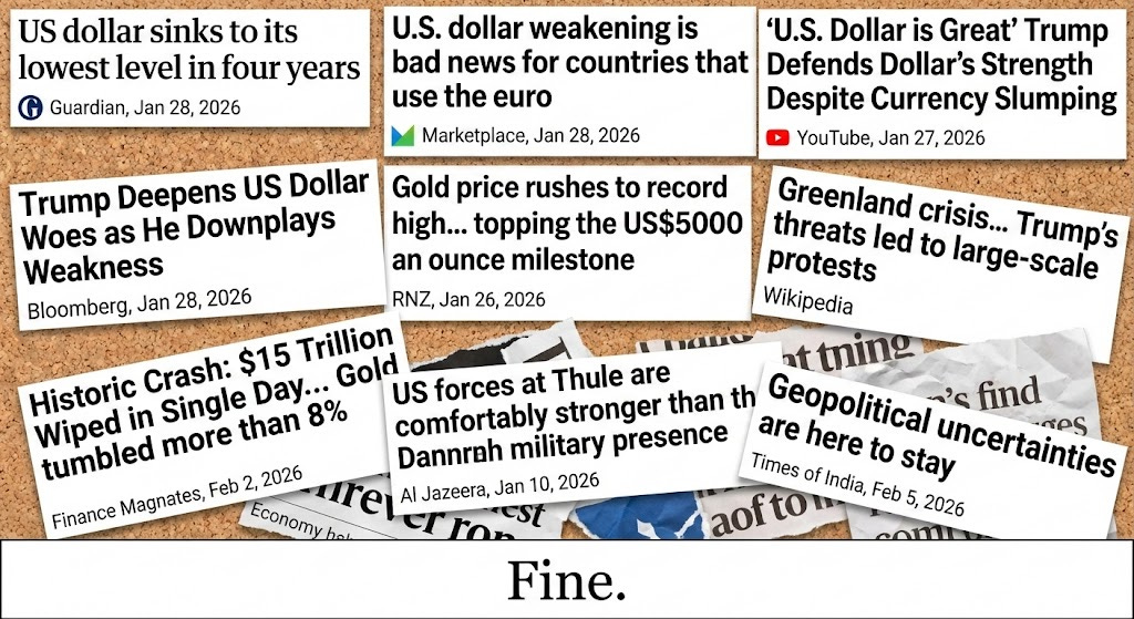 Anyway, the dollar fell partly because of Greenland. Or at least, the Greenland situation contributed to a general sense of “we don’t know what’s going to happen next,” which is not a sentiment that global currency markets respond to with enthusiasm. Markets like predictability. Markets like knowing what the rules are. Markets do not like waking up in the morning and discovering that today’s geopolitical crisis involves a large Arctic island with a population smaller than most mid-sized American cities.